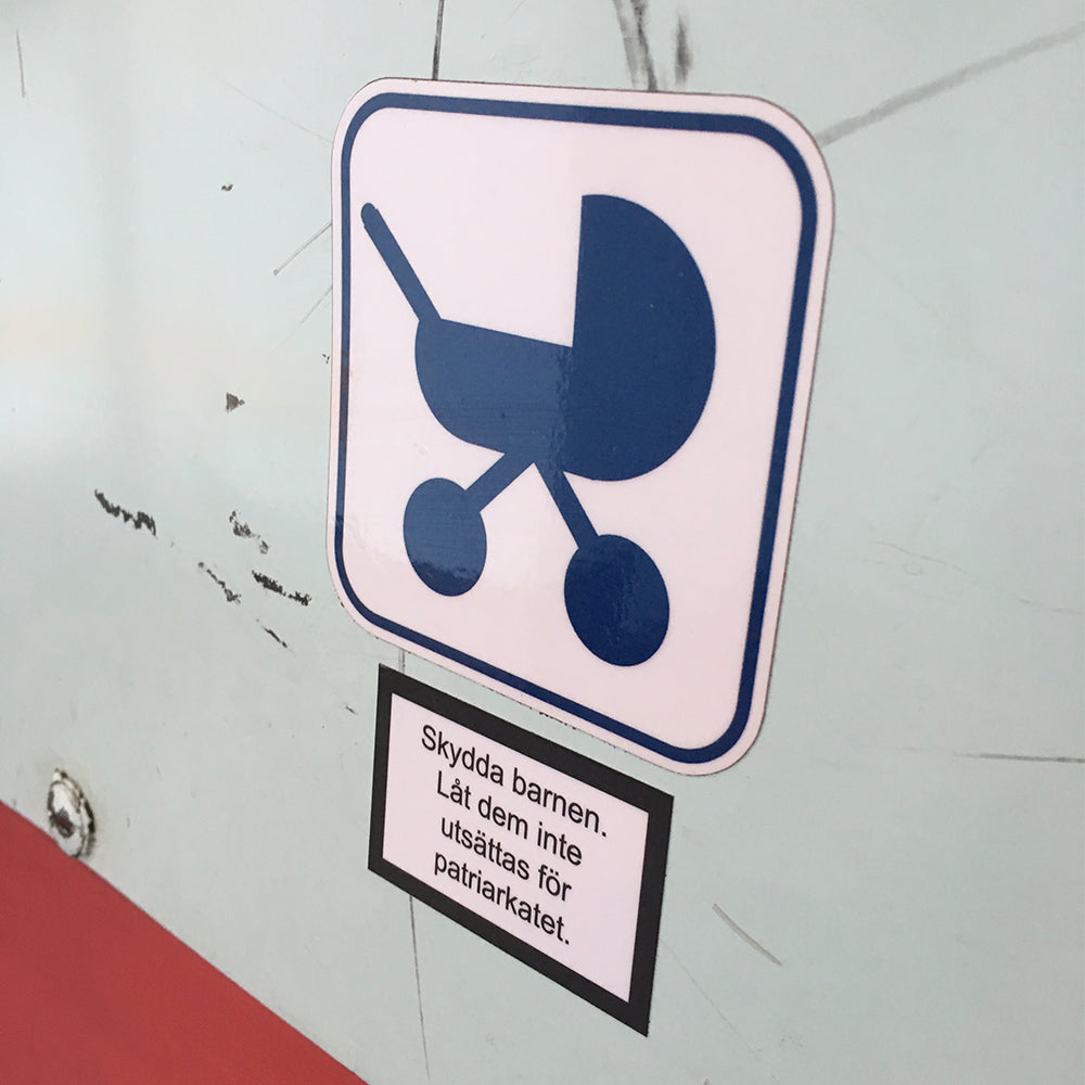 Ett klistermärke som varnar för patriarkatet. Skydda barnen. Låt dem inte utsättas för patriarkatet.