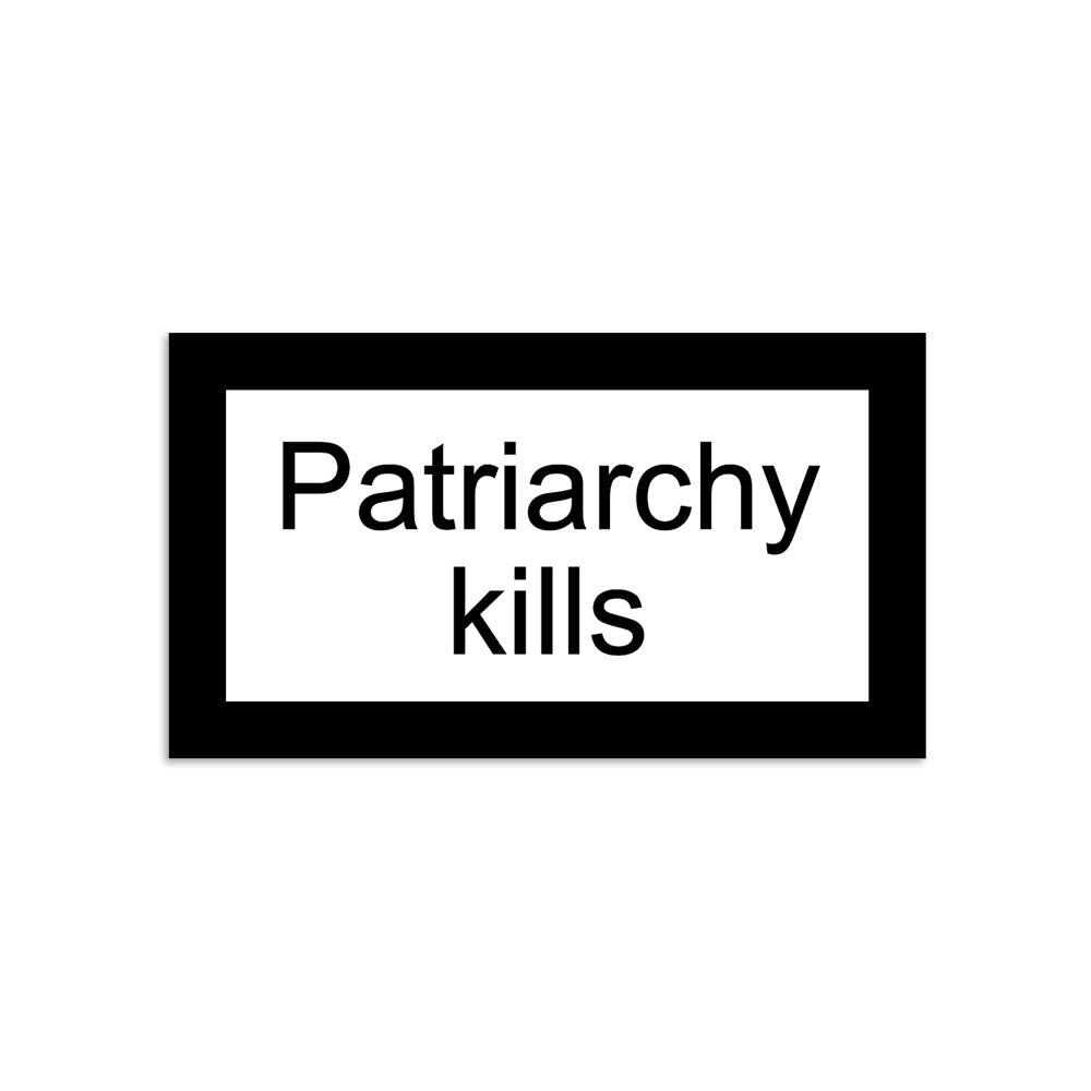 En magnet som varnar för patriarkatet på engelska. Patriarchy kills.