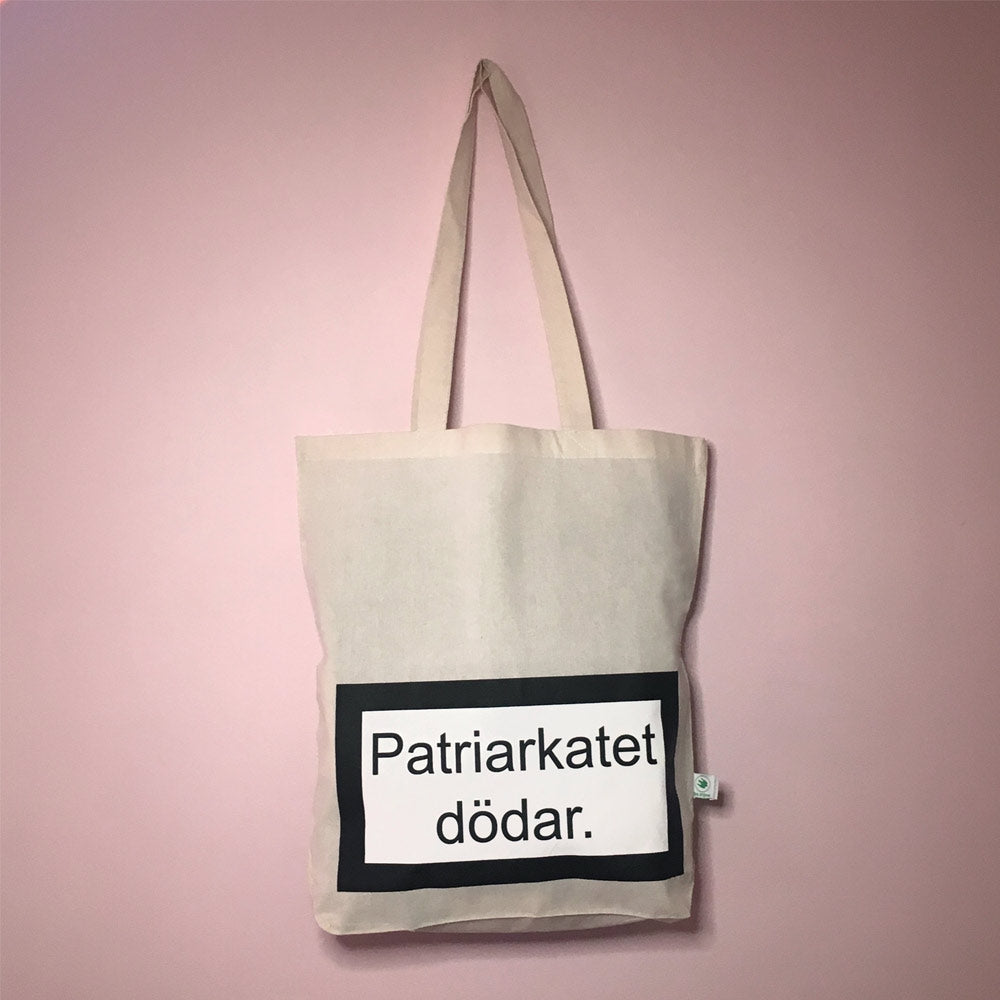 Tygväska med varningsskylt. Patriarkatet dödar.
