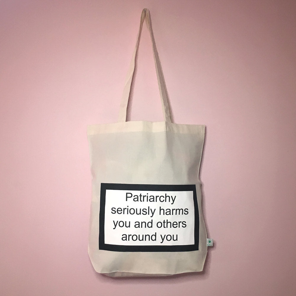 Tygväska med varningsskylt. Patriarchy seriously harms you and others around you.