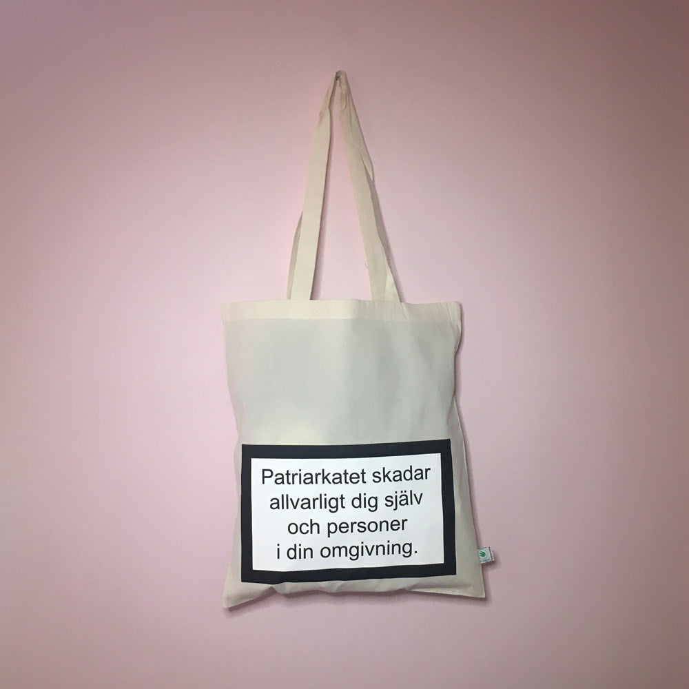 Tygväska med varningsskylt. Patriarkatet skadar allvarligt dig själv och personer i din omgivning.